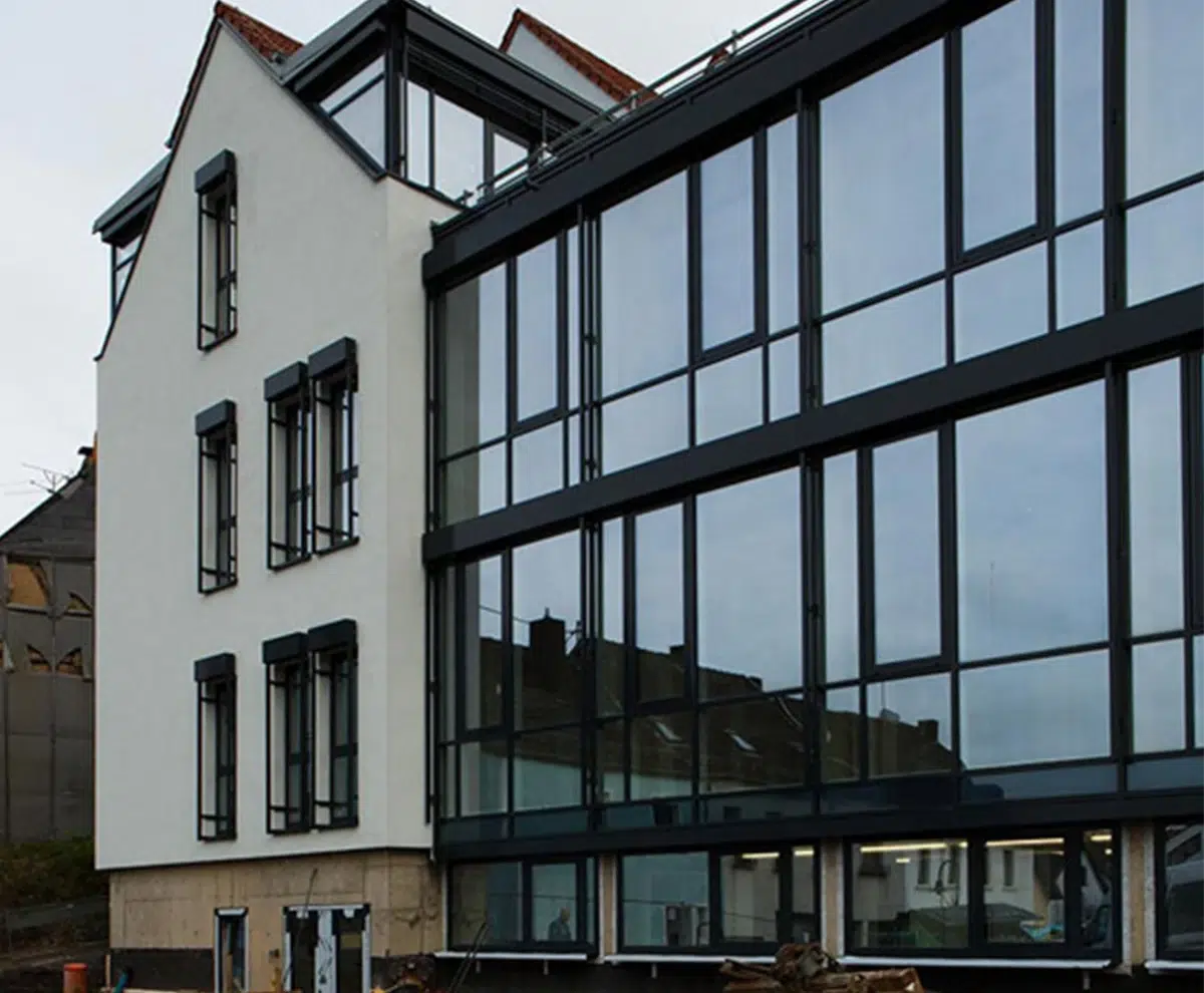 Neugestaltung im Stadtkern zur Nutzung als neues Rathaus der Kreisstadt St. Wendel, Aufwändige Sanierung einer denkmalgeschützten Altsubstanz in Verbindung mit einem mehrgeschossigen Neubau in Massivbauweis.